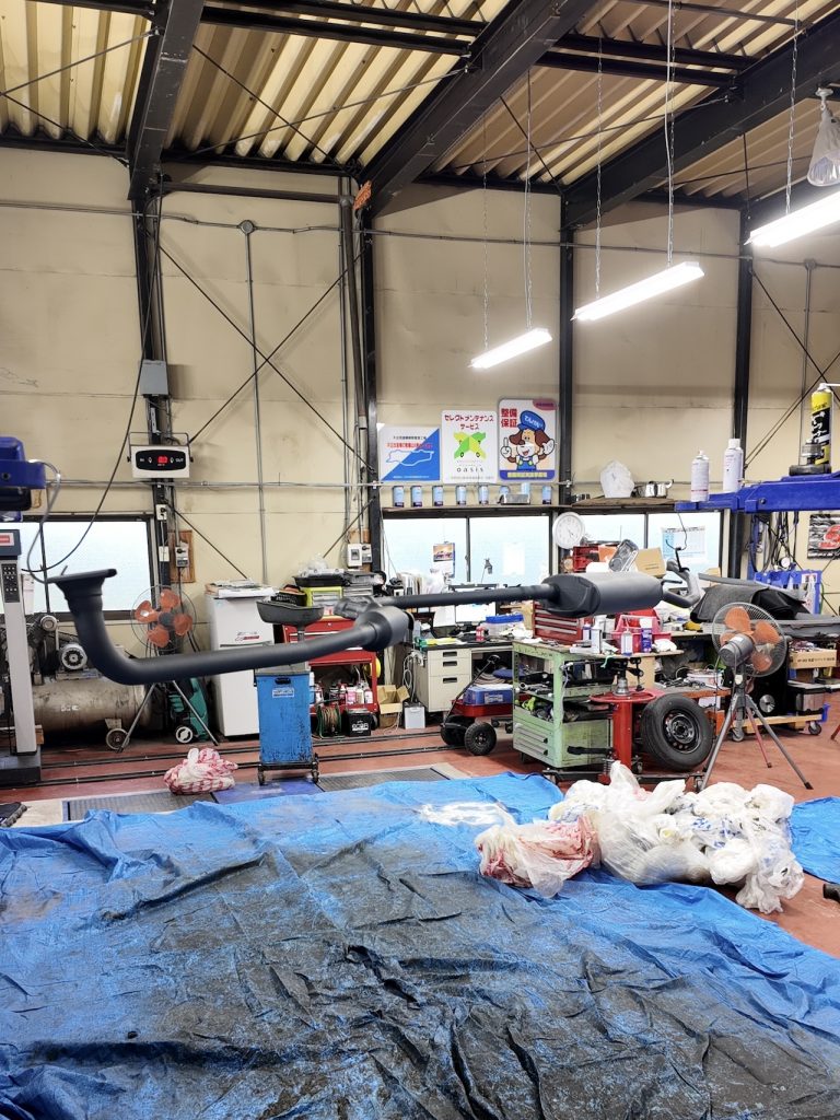 マフラーは取り外し、リフトに吊り下げて塗装しました。