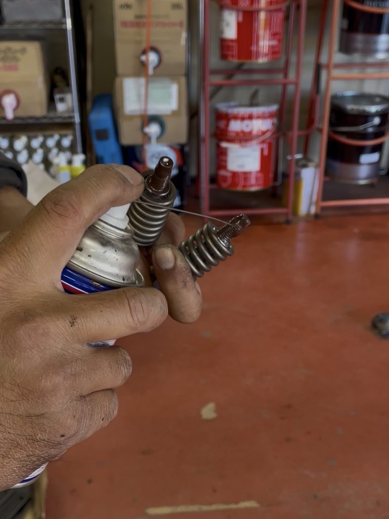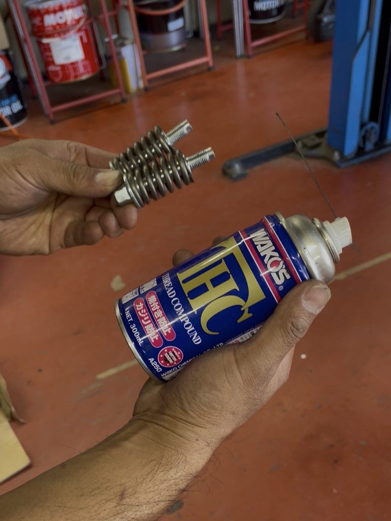 マフラーボルトに焼き付き防止の「スレッドコンパウンド」をスプレーしておきます。