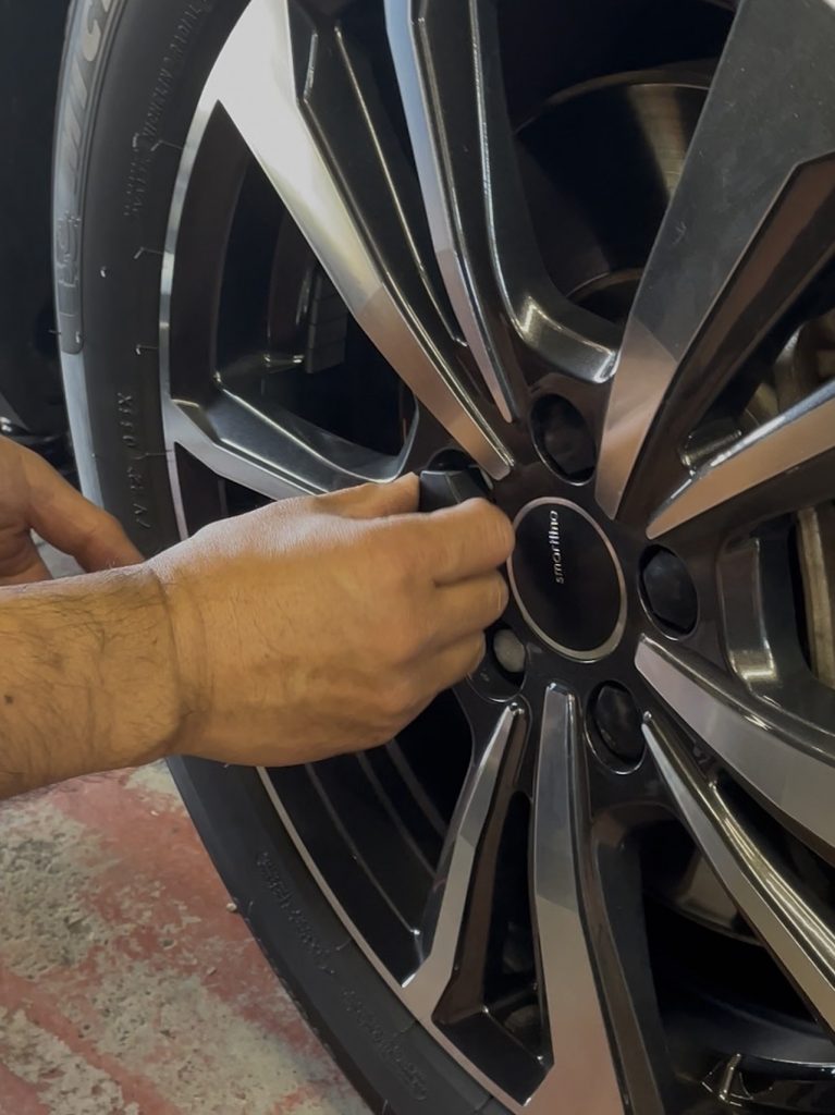 履き替えの仕上げに、盗難防止タイプのホイールキャップを装着。