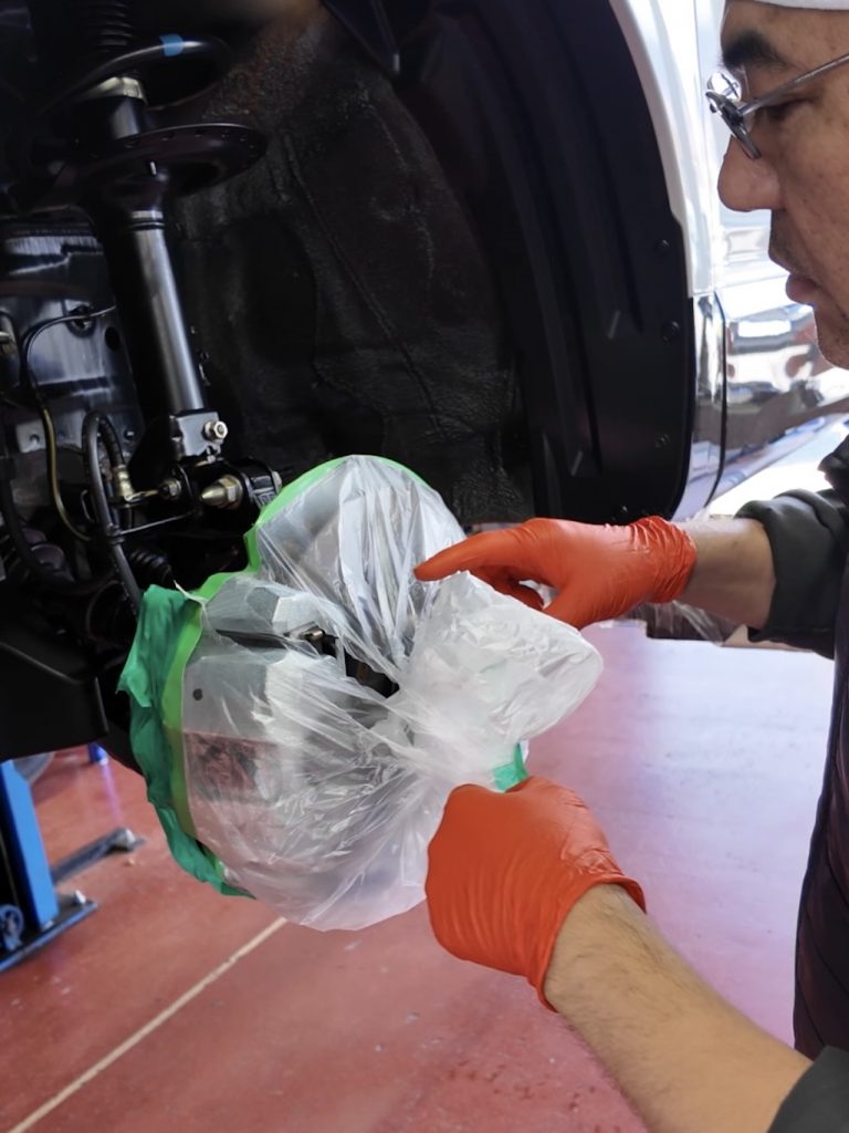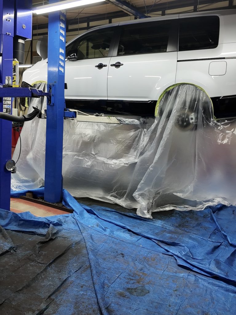マスカーで下廻りを囲い、ボディに塗料が飛ばないよう養生。工場内のシャッターも閉めて作業します。