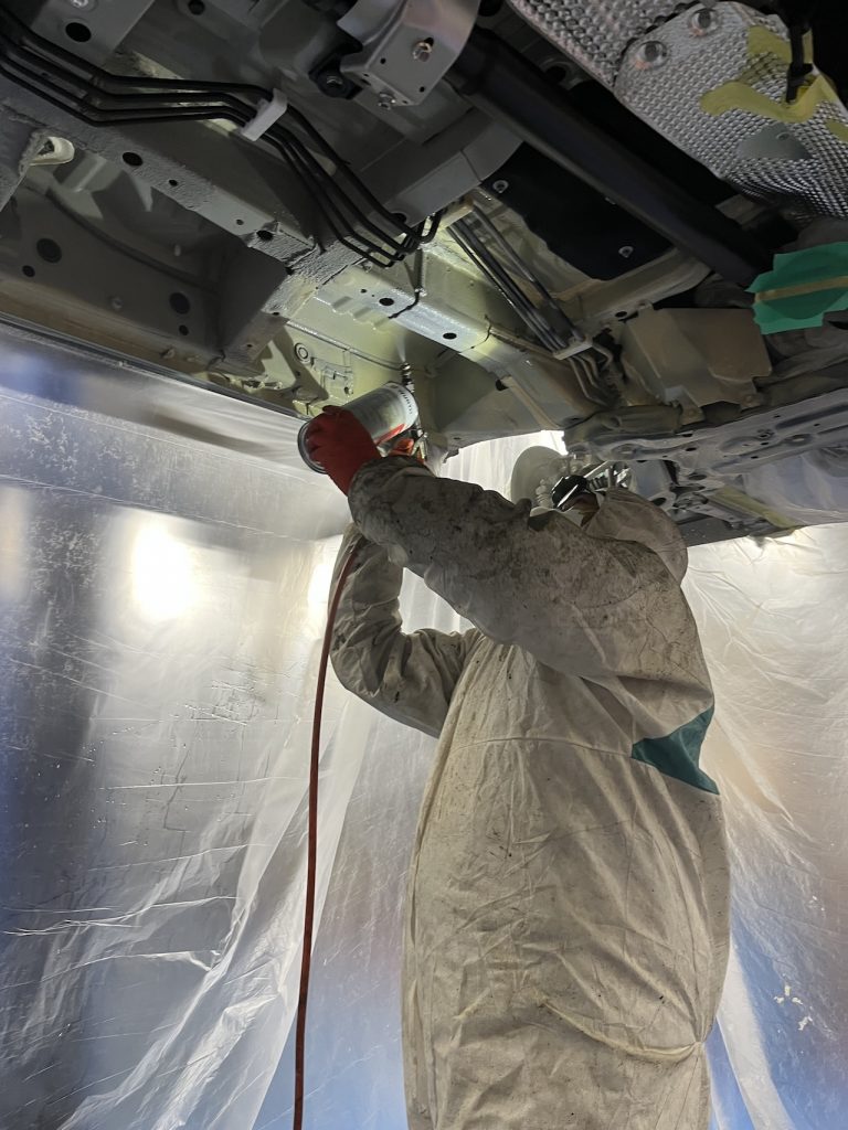 サイドフレームの中空部にも、スプレーガンで塗料を噴射し、空洞内部もしっかり保護。