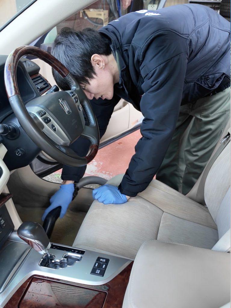 シートはアルカリ電解水と温水を使って汚れを浮き立たせ、バキュームクリーナーで丁寧に吸い取りました。