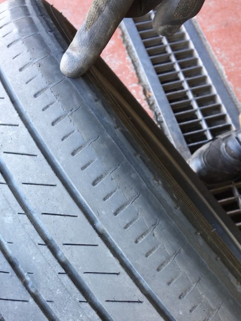 3年ほど使用したタイヤですが、空気圧が低い状態が続き、偏摩耗が起きていました。